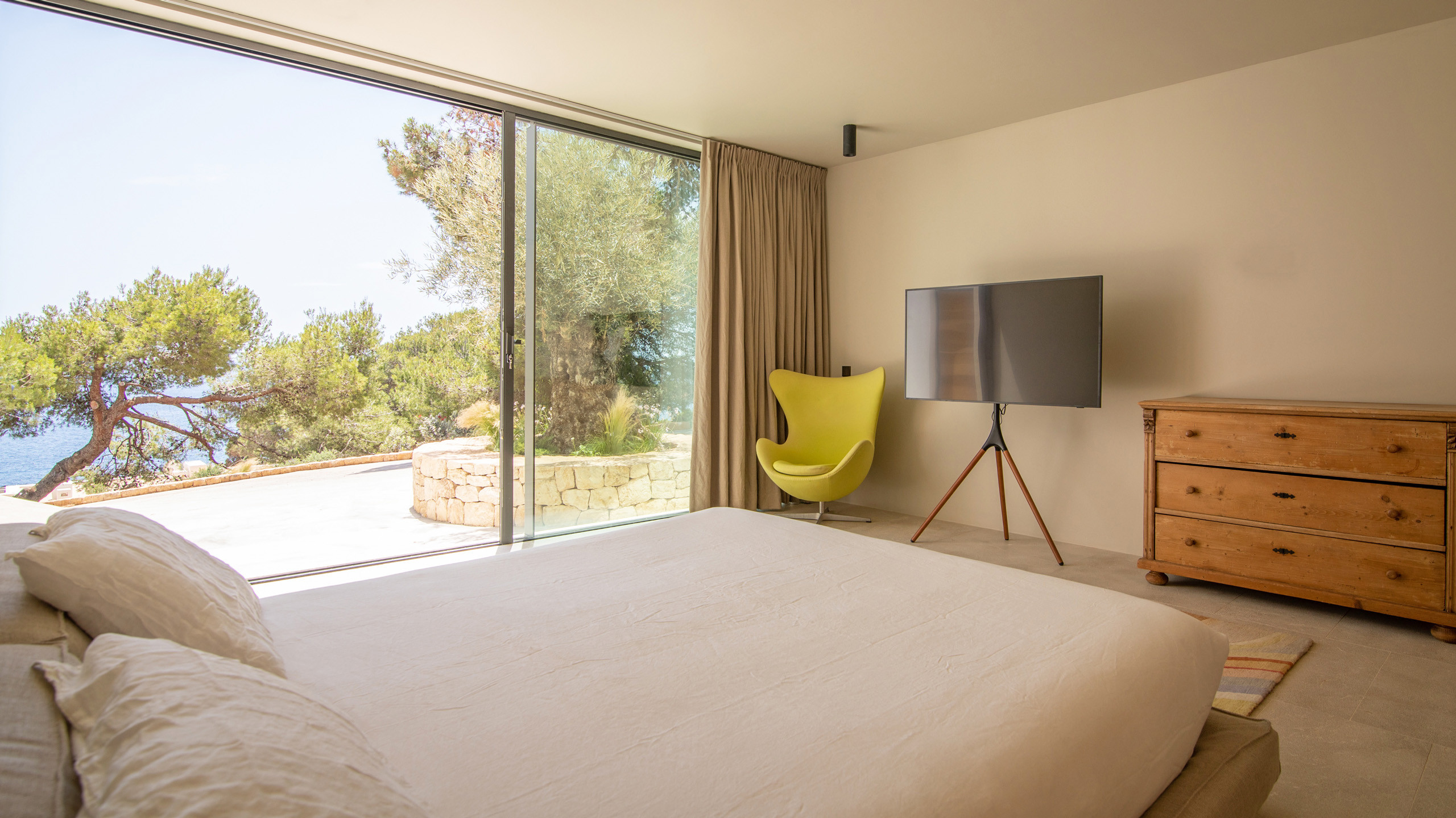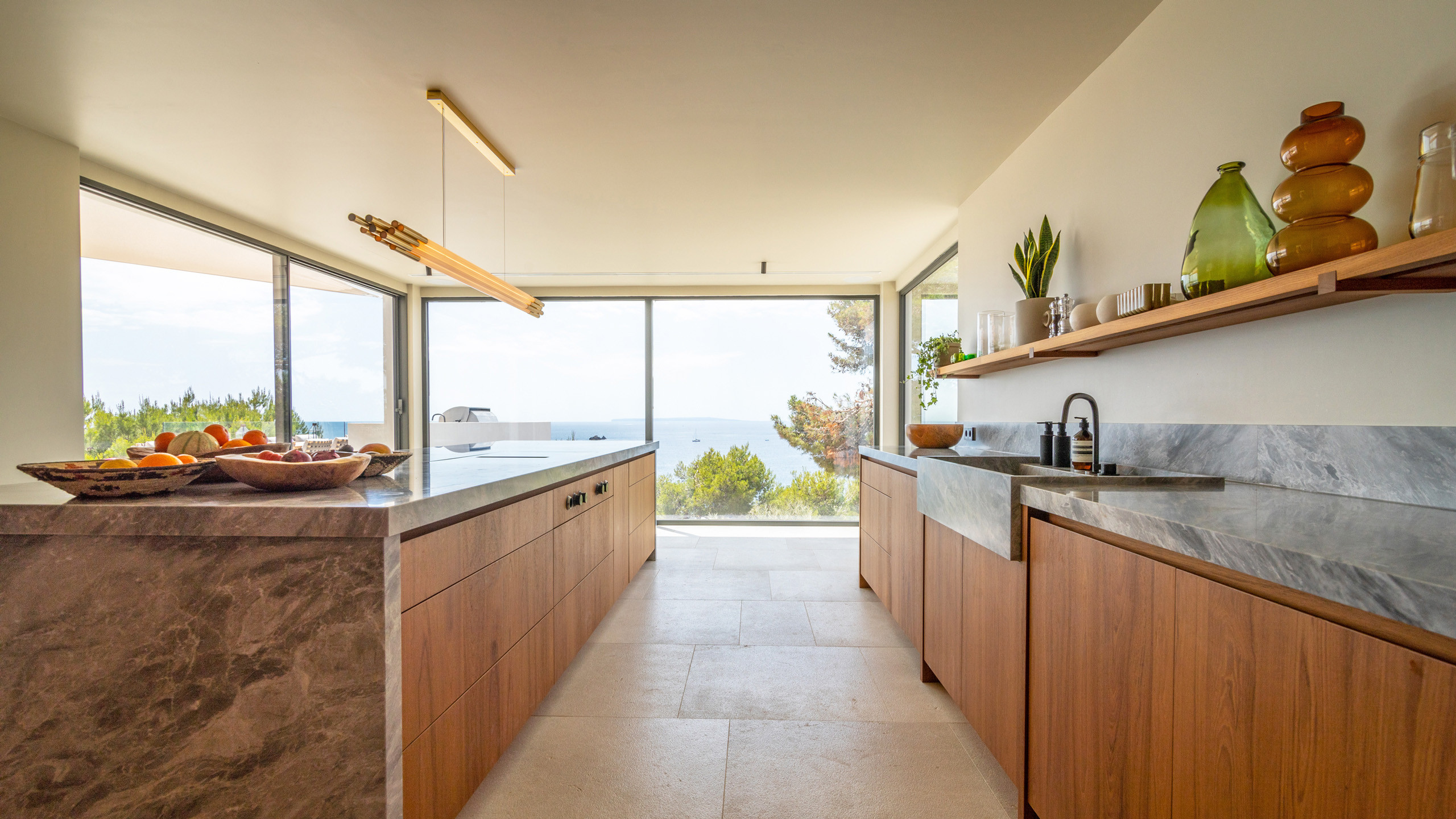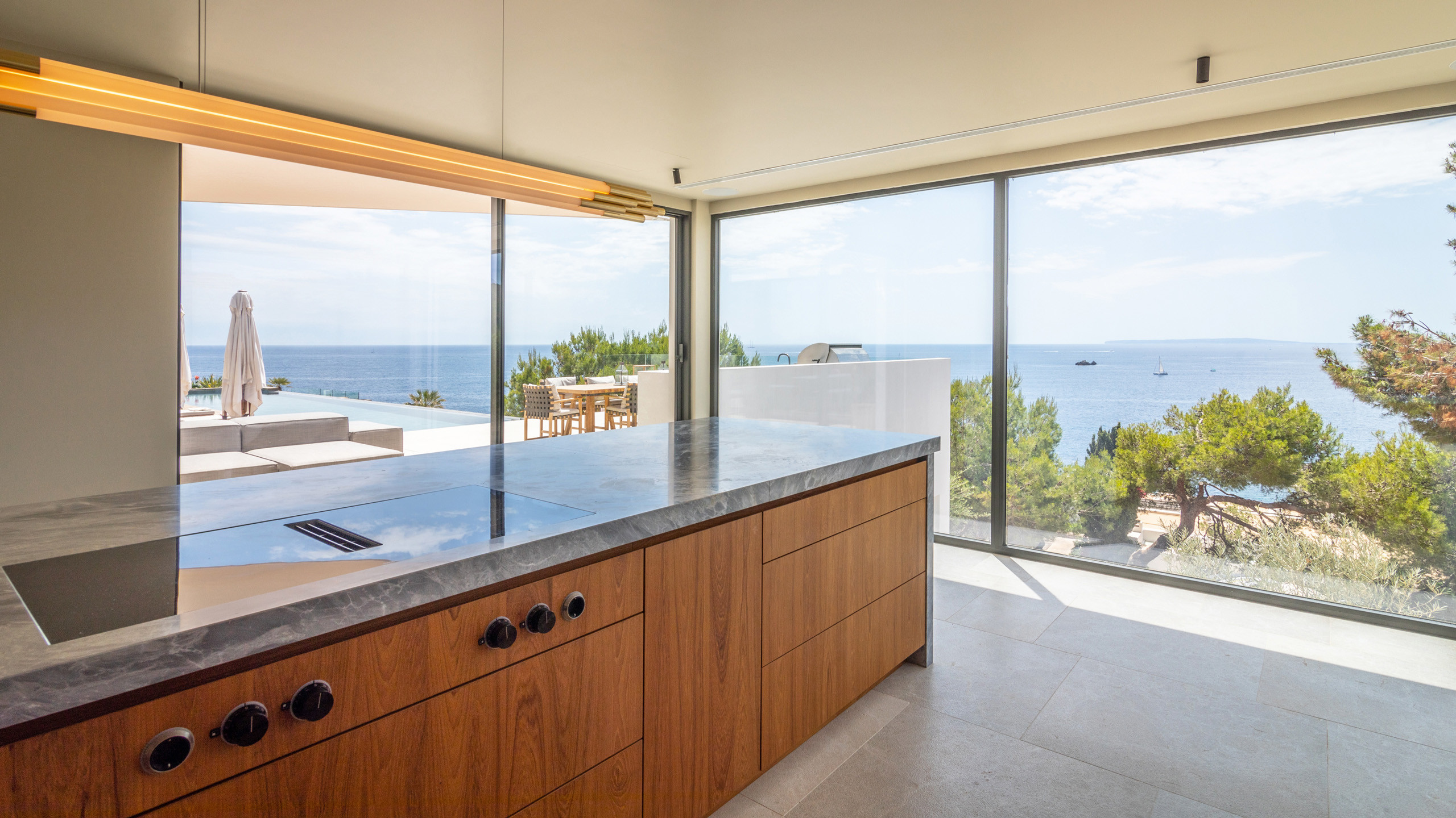 L’architettura è contemporanea con linee squadrate, pareti bianchissime e ampie vetrate che lasciano filtrare abbondantemente la luce naturale all’interno dell’abitazione. Esternamente troviamo l’attraente piscina infinity circondata da una moltitudine di zone attrezzate per il relax degli ospiti a tutte le ore del giorno, concepite per sfruttare al massimo la splendida vista mare.