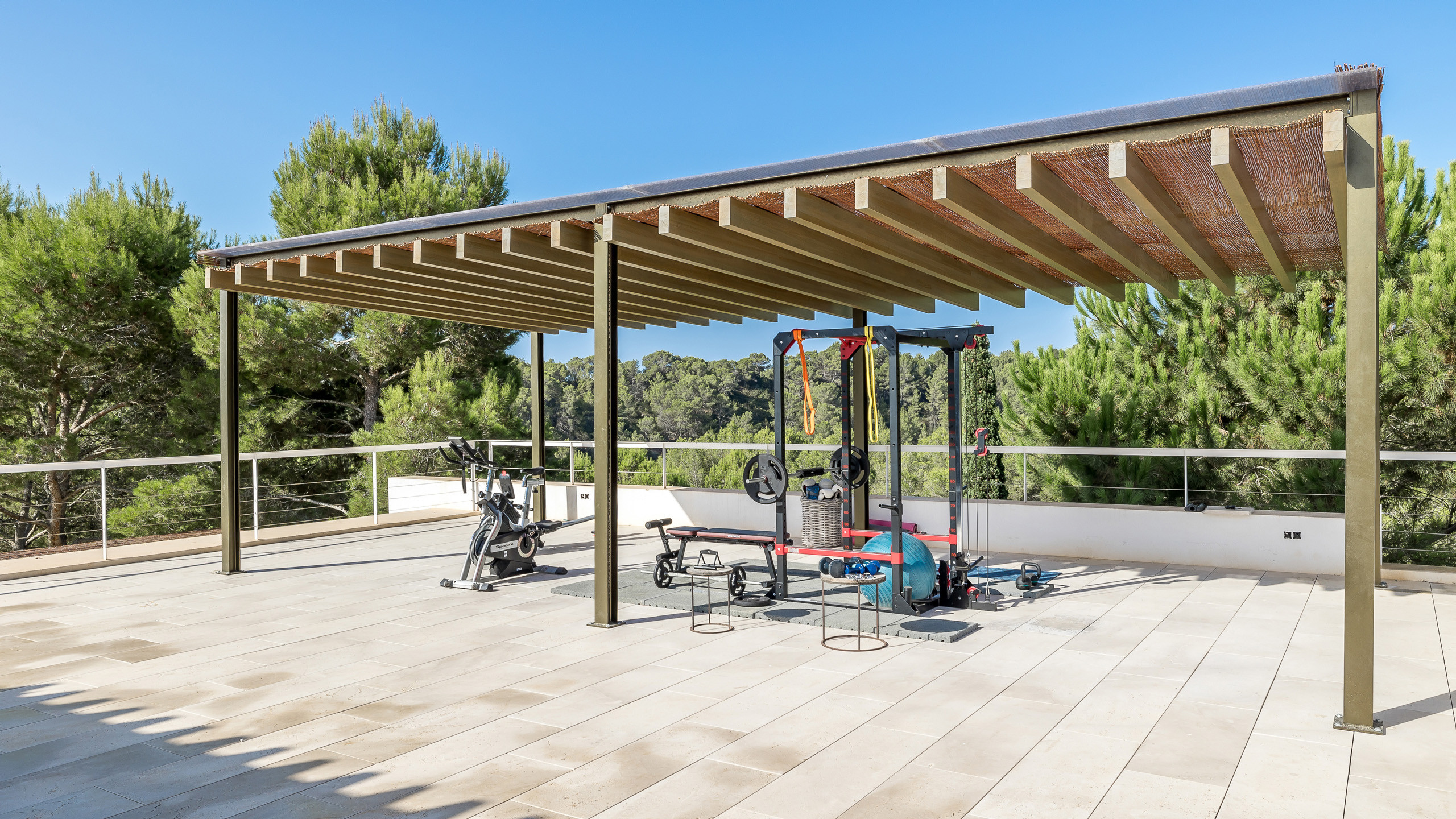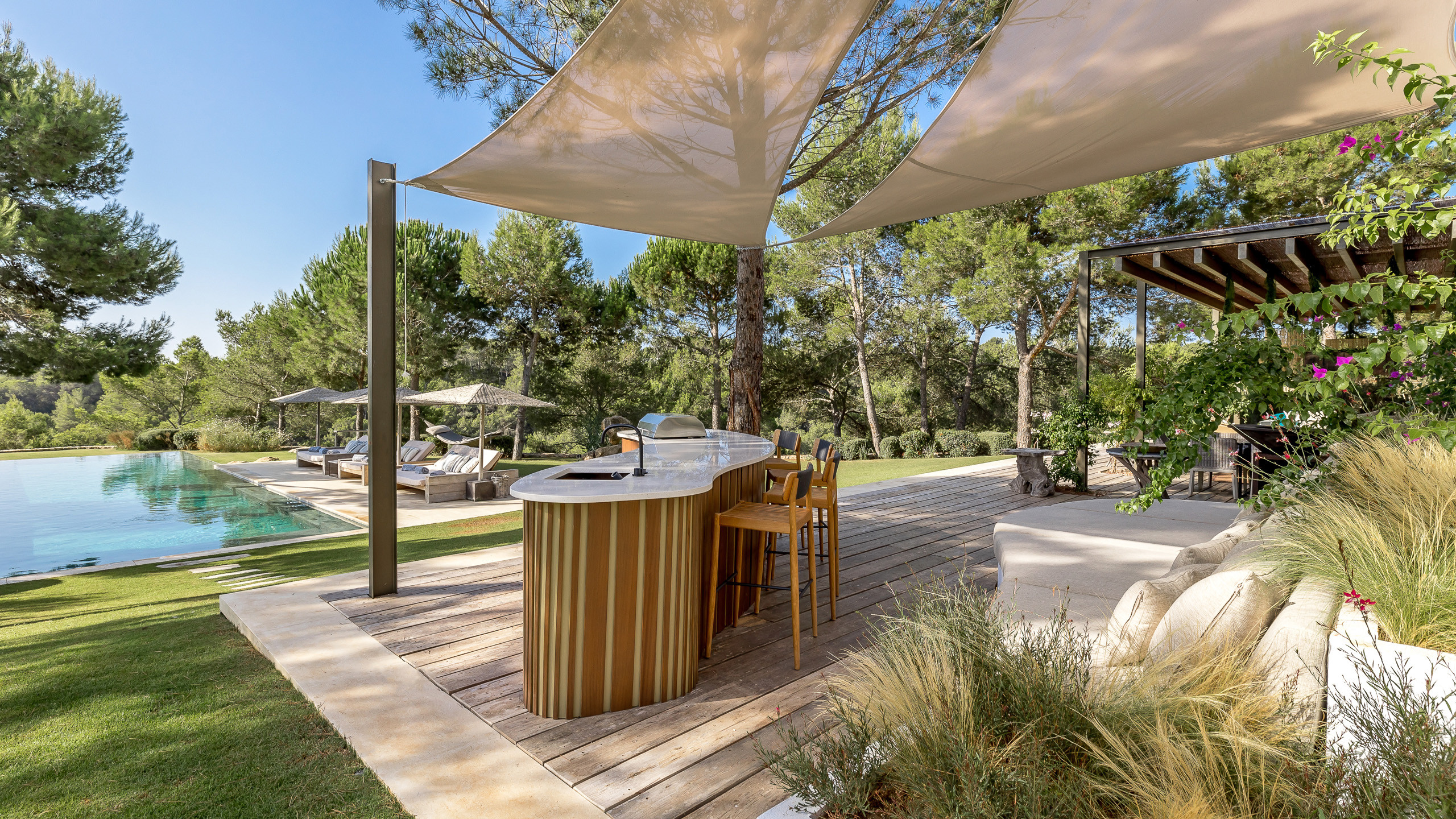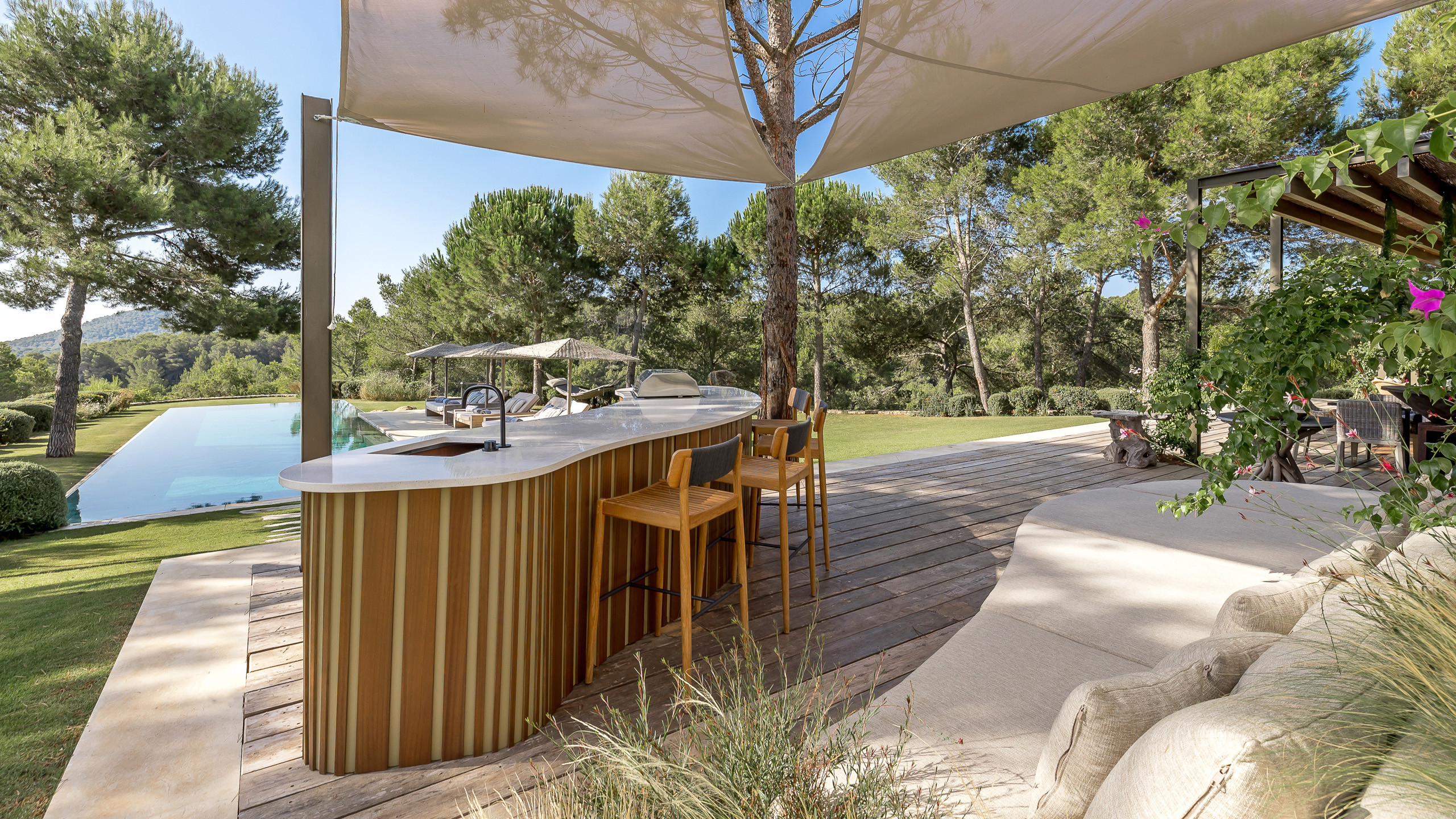 La proprietà è completamente circondata da una rigogliosa pineta, l'ampio prato verde in cui si inserisce la piscina e le varie zone relax per gli ospiti è perfettamente curato, ideale per famiglie con bambini che possono giocare in piena sicurezza e tranquillità. L'architettura dell'edificio è di chiara ispirazione contemporanea, che si inserisce in ogni caso in maniera non invadente nello scenario idilliaco circostante.